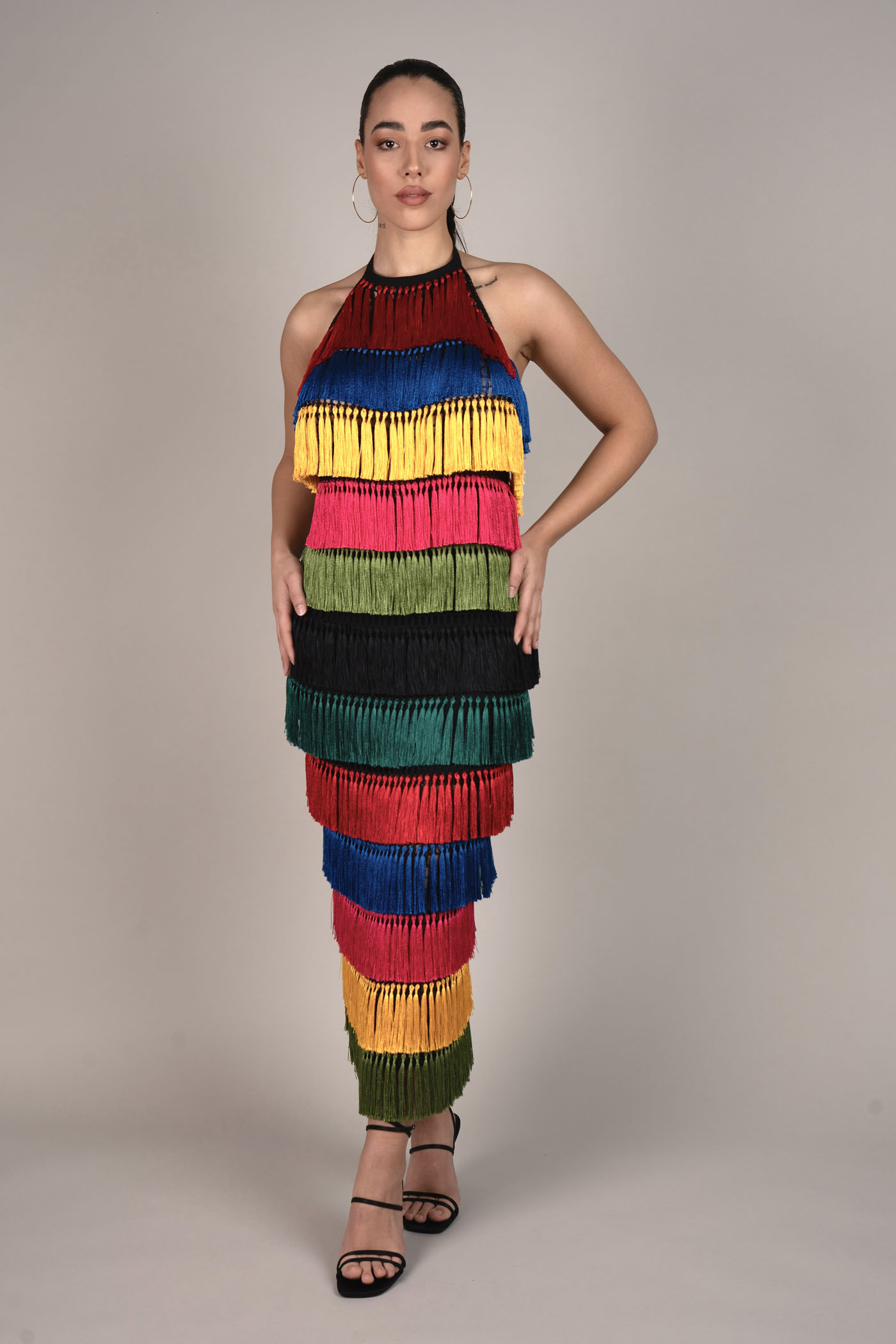 Dieses Kleid ist handgefertigt und einzigartig, unsere Kunsthandwerker machen den ganzen Prozess von Hand. Mehr als tausend Quasten wurden bei der Herstellung des Rio-Kleides verwendet. Der Farbverlauf ermöglicht es Ihnen, vielseitig für jede Gelegenheit (Casual, elegant).